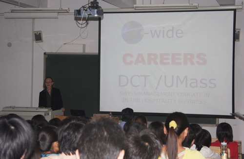 Ms.Sharon女士首先讲述了世界酒店管理业的发展情况和瑞士的基本国情,并具体介绍了瑞士DCT国际酒店及商业管理学院的办学情况。DCT拥有高质量的教学水平和高素质的教师群体,自1991年始以其专业的酒店管理教学模式及国际化的学习氛围吸引了来自全世界四十多个国家的国际学生。学院成立至今,亦已成为瑞士颇具声望的专业酒店管理学院之一。