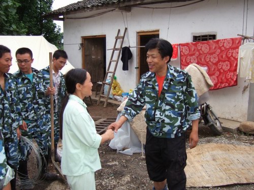 6月7日,在完成当天任务返回住所途中,路遇顺江村村民赖春荣求助,他家里只有两个80多岁的老人和两个妇女,自己无力安装政府发放的救灾帐篷。大家一致表示:再苦再累也要在天黑之前把老乡的帐篷搭好。于是,在万国平、郑丙茂、张洪老师的带领下,8名队员不顾一天的疲劳前往老乡家搭帐篷。老乡家的房屋部分倒塌,未倒塌的房子墙上也有较宽的裂缝,无法居住。8名队员首先将老乡自己用树枝和竹席搭建的破帐篷拆除,清理好现场后,在原地为老乡搭起了救灾帐篷。看着崭新漂亮的救灾帐篷,老乡非常高兴,80多岁的老奶奶拿出了面包蛋糕以示感谢,队员婉言谢绝。尽管队员们都很疲惫,但大家心里很高兴,因为通过自己的努力让灾区的一家人脸上露出了灿烂的笑容。