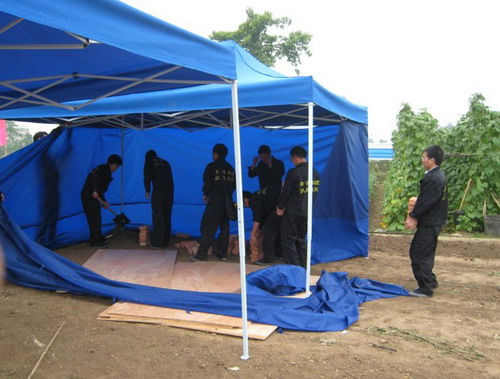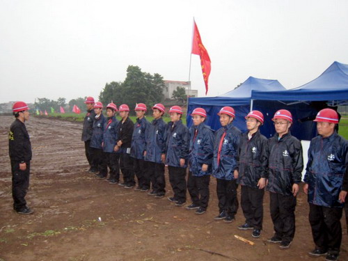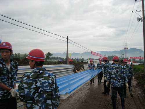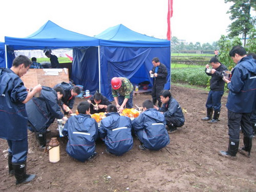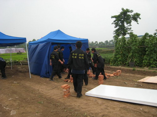 到达工地以后,队长胡修池一声令下,全体队员开始搭建自己住的帐篷。工作开始不久天下起了雨,突击队员冒雨奋战2个多小时,在傍晚7点30分搭起了三顶帐篷,并在抗震救灾的工地上竖起了我们自己的两面旗帜“黄河水院抗震救灾突击队”、“黄河水院抗震救灾众志成城”,此时突击队员已是饥肠辘辘,衣服全湿。之后,队员们在路边小店简单吃了些东西充饥。