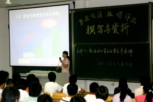 曾主任首先讲解了大学生职业生涯规划的意义和职业规划大赛评选规则,并就如何撰写职业规划作品进行了重点讲述,向同学们介绍了进行职业规划的各种方法。随后,曾主任还对2007年“河南省第二届大学生职业规划大赛”中的优秀作品进行了现场展示和点评。