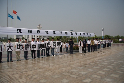 下午14点10分,我院师生在有序地来到校南门广场国旗前集合。巨大的横幅“沉痛哀悼汶川地震罹难的同胞!”被布置在广场前方,沉痛的人们静静地向死难者默哀。院党委副书记、纪委书记王卫东主持公祭仪式,院党委书记、院长刘宪亮在公祭活动上讲话。