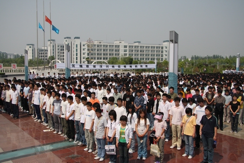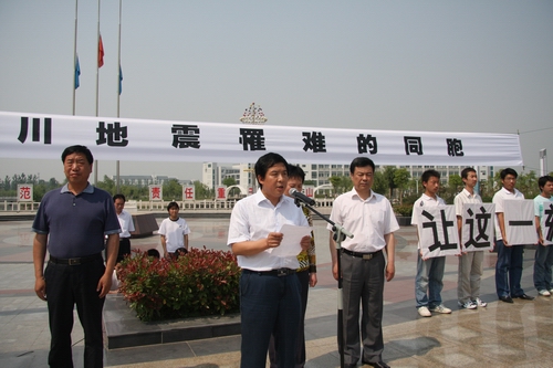 2008年5月19日14时28分,我院上空防空警报鸣响,院领导刘宪亮、张惠贞、孙五继、茹正波、王卫东、刘紫婷带领全院一万多名师生,和全国人民一起向四川汶川大地震遇难同胞默哀3分钟。