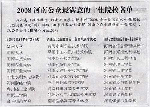 5月7日,由河南日报举办、河南公众参与投票的“2008读者最满意的十佳院校大型调查评选”揭晓,我院荣居河南公众最满意的十佳高职高专院校第一名。