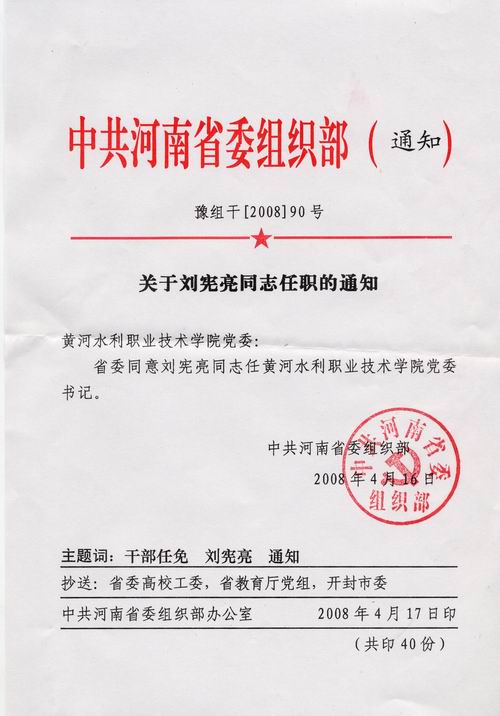 4月17日,中共河南省委组织部下发《关于刘宪亮同志任职的通知》(豫组干〔2008〕90号),同意刘宪亮同志任我院党委书记。