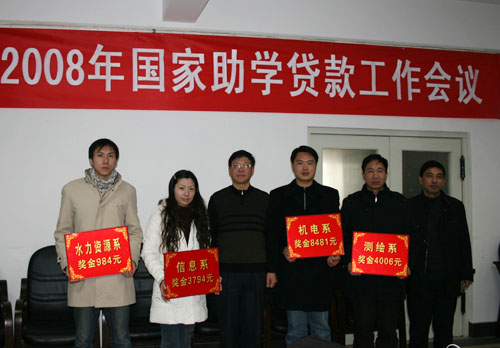 在上午的助学贷款工作会上,王书记强调了开展学生资助工作的重要意义,对我院近年来学生资助工作取得的成绩给予了充分肯定,并对今后进一步作好助学贷款工作及学生管理工作提出了要求。学生处处长菅浩然在对我院2007年度国家助学贷款进行了总结,他说,2007年我院共为1861名同学办理了助学贷款,贷款金额838.07万元,共有1323人提前还款、还息,助学贷款工作取得很大的成绩;他还对2008年工作进行了部署。之后,各系(部)负责国家助学贷款工作的同志进行了经验交流。学生处副处长李响就施行《黄河水院国家助学贷款工作绩效管理办法》进行了解释说明。学院还对2007年国家助学贷款工作成绩突出的系部进行了奖励。
