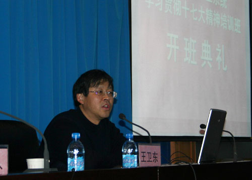 党委副书记、纪委书记王卫东参加了开班典礼并作了培训动员。王书记在动员报告中要求,全体学工人员要提高认识,高度重视党的十七大精神的学习宣传和贯彻落实,同时对学工系统如何以人为本、贯彻落实科学发展观、联系实际进行了深入细致的阐述。上午开班典礼结束后,大家共同收看了河南省高校工委书记、教育厅厅长蒋笃运同志在全省高校领导干部学习十七大精神轮训班上的报告录像。下午社科部李建设主任做了题为《旗帜·方向·道路》的十七大精神辅导报告。辅导报告结束后,大家在结合工作实际分组交流的基础上,各组推荐学员代表进行了大会交流发言。培训结束时,学工部部长菅浩然作了总结讲话。
