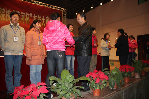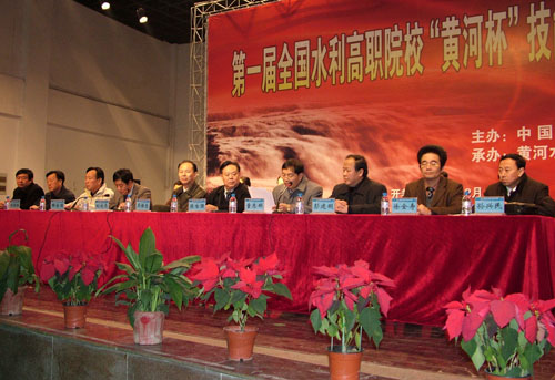 中国水利教学协会副会长彭建明在闭幕式上讲话。他说,本次大赛在中国水利教育协会、教育部水利水电工程专业教指委和黄河水院的精心准备、严密策划下,全国21所高职院校积极参与,取得了圆满成功。众多优秀选手参与比赛,保证了竞赛的质量与水平,展示了水利高职院校学生的技术水平和各院校的教育风采。同时大赛为水利院校互相交流、共同提高提供了平台,希望“黄河杯”技能大赛能够越办越好,成为水利高职院校之间的精品赛事。他还寄语参赛选手要树立“学水利、爱水利、干水利”的信念,为水利现代化建设施展自己的聪明才干。
