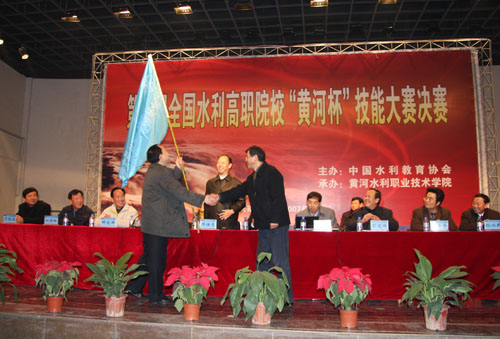 中国水利教育协会会长周保志宣布了2008年全国水利高职院校技能大赛承办单位——杨凌职业技术学院。我院党委副书记王卫东与杨凌职业技术学院代表进行了赛旗交接。