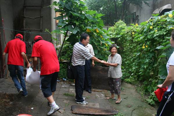 随后,服务团师生一行冒雨来到范庄村东村,为那些在生活中有困难的住户送上大米、面、食用油等生活必需品。在村东头,70多岁的孤寡老人握着同学们的手,激动得热泪盈眶。