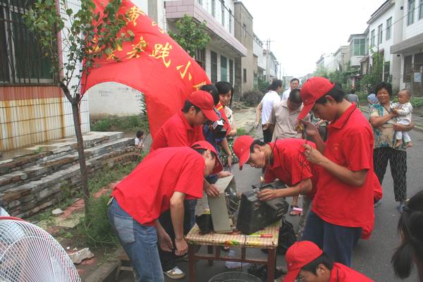 上午十点钟,雨停了,服务团成员立即投入为范庄乡亲们义务维修电器的工作中,同学们利用自身扎实的专业技术,为村民义务维修了电视机、洗衣机、电风扇、收音机,遥控器等家用电器20余台。同学们一直忙碌到下午,把科技文化知识带到了农村,真正服务了农村。