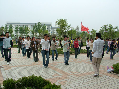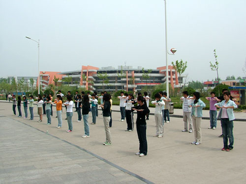 上午10时全国亿万学生阳光体育运动在全国范围内全面启动,伴随着广播里北京主会场的启动仪式现场直播,我院学生有组织地走出教室,因地制宜开展了适合各自特点的体育活动。有的系部组织学生环绕校园慢跑,有的系部组织学生到运动场打排球、篮球。还有不少学生以班级为单位在打太极拳、做广播体操等。
