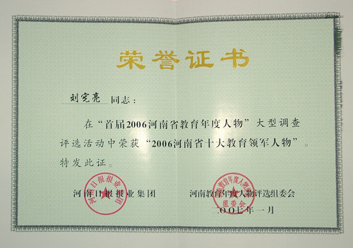 1月22日,经过两个多月评选的首届河南省教育年度教育人物揭晓,我院院长刘宪亮荣获“2006河南省十大教育领军人物”称号。