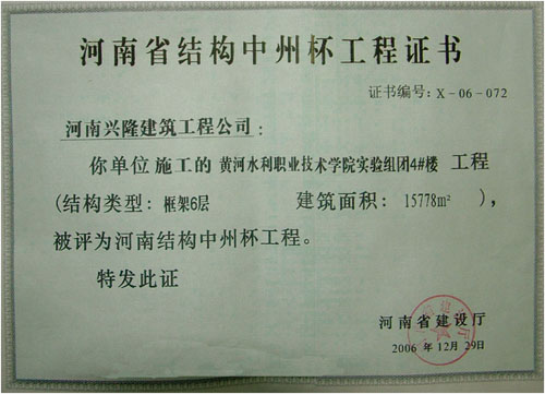 近日获悉,我院实验组团4#楼获得省级建设工程质量最高荣誉奖“结构中州杯”奖。根据《河南省优质结构工程评审管理办法》(豫建建〔2005〕152号文)规定,经河南省优质结构工程评审委员会审定通过并经公示的2006年度河南省下半年结构中州杯工程,共104项。