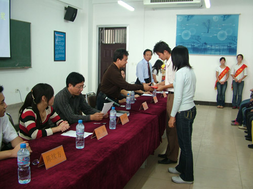 管理系主任孙全治介绍了首期订单班10名优秀学生的产生过程,并宣布了获奖学生名单。公司领导与学院职能部门领导分别为10名同学颁发了200元到500元不等的奖金。