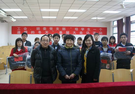 随后,与会领导向各系选出的14名品学兼优且家庭困难的学生赠送了过冬用的物品,并与同学合影留念。