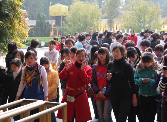 第二阶段是景区现场教学阶段。10月27日至28日,结合2010年河南省导游人员资格证书考试的考核内容,安排学生赴洛阳龙门石窟、郑州少林寺、新郑黄帝故里、河南省博物院等知名景区进行现场教学。在现场教学过程中,学生通过现场观摩指导教师和景区讲解员的讲解,在导游讲解能力、现场应变能力、知识运用能力等方面有了更加深刻的体验和收获。在旅游车上,学生分组进行了沿途讲解,随后进行教师进行现场点评;一路上“导游”还为“游客”表演各种节目,现场气氛十分活跃,取得了较好的教学效果。