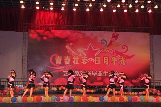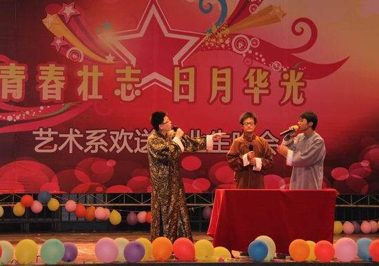 6月25日晚,艺术系欢送毕业生晚会在风雨球场举行,该系2010届毕业生在此集聚,用青春无悔唱出大学生最动人的旋律。副院长刘紫婷、院团委书记周志琦、副书记谷献晖,科研外事处处长张春满、副处长陈琳、学生处副处长李响,以及艺术系全体教师出席了此次活动。