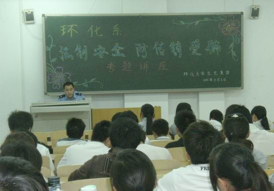 5月6日晚,应环化系邀请,开封市公安局网络稽查队张永成警官为环化系学生开展了法制安全教育、防网络诈骗传销受骗知识讲座,该系200多名师生聆听了讲座。
