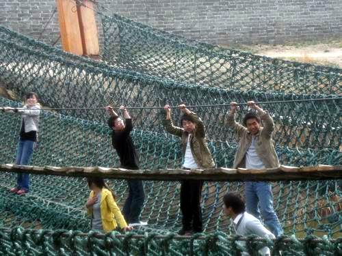 在园区内,参加活动的同学分作两组,直奔极限挑战区。同学们积极踊跃,先后比赛了走钢索,走吊桥,攀绳,走吊木,荡秋千等活动。随后大家共同观看了园区抗日题材系列表演。