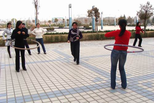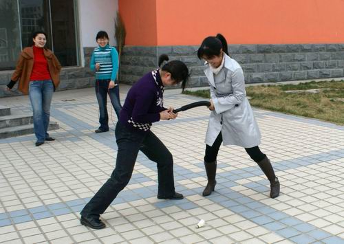 健身活动以比赛的形式进行。在八号实训楼东侧空地上,十余名教师分为两组,进行了激烈的呼啦圈比赛,运动员奋力角逐,啦啦队热烈欢呼,把大家的情绪都调动起来。随后举行了包括室内乒乓球、室外呼啦圈接力、跳绳、羽毛球比赛等一系列比赛活动。
