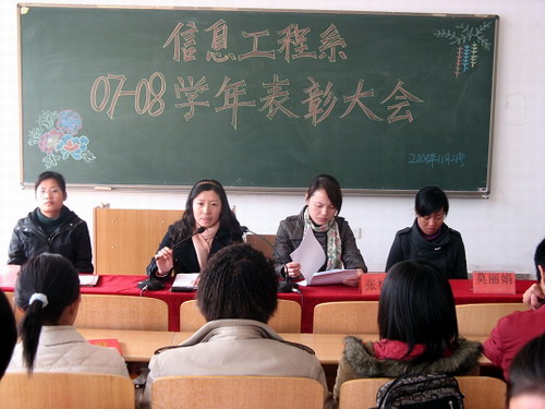 11月21日,信息工程系举行了2007-2008学年学生先进集体、先进个人表彰大会,以鼓励一学年来在学习和工作中表现优秀的先进班集体和个人。大会由负责系学工和分团委工作的张校慧老师主持,系党总支副书记殷莺老师和全体辅导员出席大会,部分获奖学生代表参加了会议。