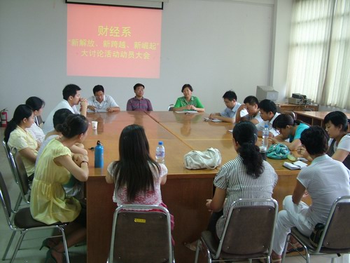 8月5日上午,财经系“新解放、新跨越、新崛起”大讨论活动动员大会在8306教室举行。财经系党总支书记张玉姣、系主任张辉、党总支副书记宋建涛及全体教工党员参加了会议。