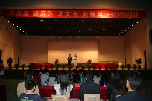 为了迎接2008年北京奥运会,普及礼仪知识,丰富同学们的课余文化生活,从4月中旬起,“礼仪知识现场竞答赛”活动陆续开展。经过初赛、复赛的激烈角逐,测绘工程系、管理系、水资源工程系及自动化工程系四支代表队过关斩将进入决赛。