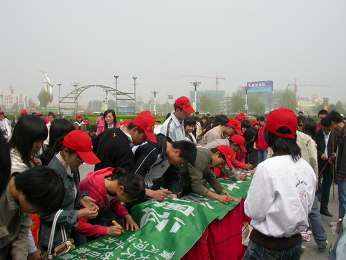 4月13日上午10点,由我院环化系环保协会主办的“倡导生态文明 喜迎绿色奥运”大型社会公益宣传活动在金明广场拉开帷幕。开封市环保局宣传科副科长许鹏等出席了本次活动。