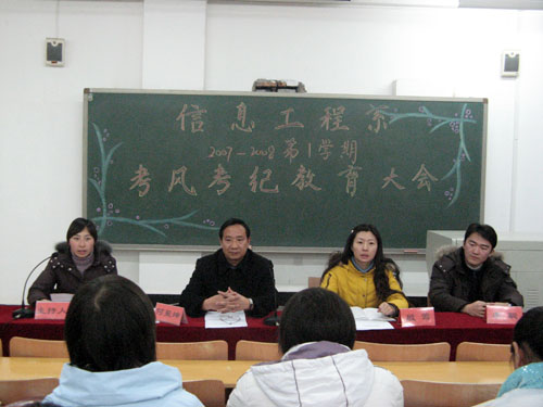 信息系讯 1月3日下午,信息工程系在教学楼2301、2302教室同时召开“信息工程系期末考试考风、考纪教育大会”。该系党总支书记何聚坤、副书记殷莺及部分老师参加了会议,会议由系学工办主任彭静静主持。殷莺副书记首先宣读了《信息工程系关于对考试违纪作弊现象的认定及处理办法》。何书记为全体同学做了《用真实的成绩证明自己的实力,为营造公平竞争的学习环境作出自己的贡献》的讲话,使同学深深体会到诚信考试的重要性,会议取得了良好的效果。