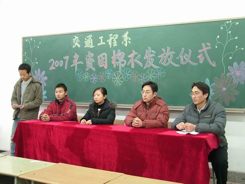 12月11日下午,交通工程系在教学楼5611教室召开了冬季资助家庭经济困难学生棉衣发放大会,46名品学兼优的学生从该系党总支副书记杜广平等老师的手中领到了厚厚的棉衣。