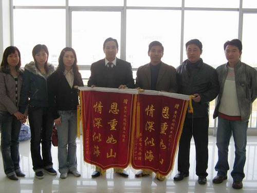 又讯 11月5日下午,石长飞同学的家长向学院赠送一面“恩重如山,情深似海”的锦旗,以示对学院给予石长飞同学关怀和照顾的感谢。院学生处处长菅浩然,信息工程系党总支书记何聚坤,副书记殷莺,系分团委书记彭静静等给予了热情接待, 并表达了全院师生对石长飞同学的关心和祝福。