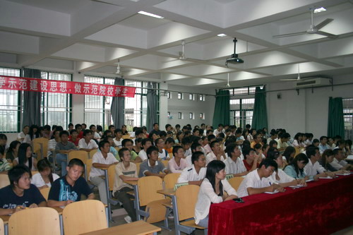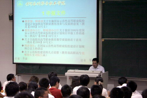 在两个小时的讲座中,张教授就我院示范性高职高专院校申报情况作了详细讲解。张教授还讲解了我院高职教育的办学特色,即主张以内涵建设为重点,以工学结合为切入点,以专业建设为核心,注重师资力量建设,加强实验实训建设,既提高了广大学生的专业技能,又满足了社会服务建设,形成了示范性高职教育建设的长效机制。