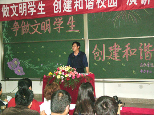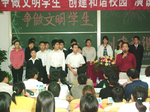 王书记作总结发言。强调这次活动是我院响应省教育厅第十届科技文化艺术节而举行的系列活动之一,具有十分重要的意义:首先,落实了“八荣八耻”精神,促使广大学生树立正确的社会主义荣辱观;第二,使“争做文明学生,创建和谐校园”这一精神深入到每个同学心中,提醒广大青年学生应肩负起的社会责任;第三,通过演讲比赛将激励广大学生团结一致奋勇向前,从点滴做起为创建和谐校园而不懈努力,为学校的未来、祖国的明天奉献自己的青春。