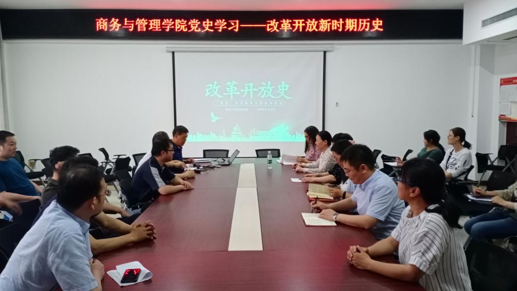 5月25日下午,商务与管理学院在党员活动室SY5420召开政治理论学习会议,集中学习中国共产党第十九届中央纪律检查委员会第五次全会精神、中国共产党河南省第十届纪律检查委员会第六次全体会议精神,结合学习资料《中国共产党简史》进行了改革开放新时期党史历史学习,观看省委宣传部、河南广播电视台联合制作的党史教育专题片《征程》。商务与管理学院全体教职工参加会议。会议由党总支书记樊建科主持。