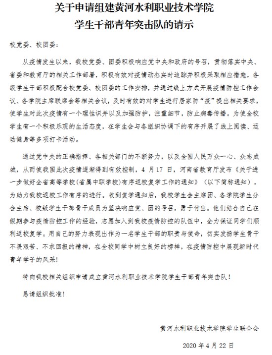 近期,我国新型冠状病毒疫情防控已经转为常态化防控,经济社会发展逐步恢复。河南省教育厅发布《关于做好各级各类学校2020年春季学期返校复学工作的通知》后,365官网也认真组织各部门做好复学准备工作。近日,校学生联合会骨干成员纷纷主动递交请战书,申请加入学校疫情防控的工作队伍;校学生联合会申请成立beat365唯一官网学生干部青年突击队,向校党委、校团委请战,尽自己所能服务同学,用实际行动践行防控责任,以实际行动助力学校返校复学工作顺利开展。