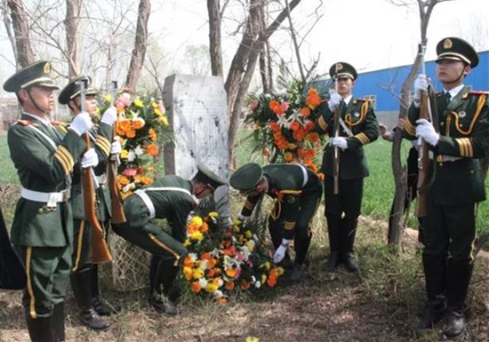 国旗护卫队成员在吴祖泰烈士墓前向烈士敬献花圈