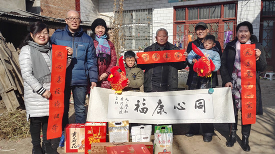 社员们怀揣着一颗颗暖暖的心,精心准备串亲戚的礼品。老社员李学翔老师早早地就准备好两大袋冬衣和蛋白粉。社员陈豫老师提早一周邀请她的一位精通书法的朋友写了一幅字“同心康福”和几幅春联,其中一幅是“同心康福缔纽带,九三农户一家亲”,横幅“常来常往”。社员赵秋霞老师说:“这个中山装的外套我买了两件,一件给我父亲,一件给牛师傅带去,该过年了,老人也得穿个新衣服嘛。”社员杨立功老师上次去牛师傅家发现他的拐杖不合适,找了一副得劲拐杖,并把自己定做的保暖内衣也送给了牛师傅。社员们还带去了大米、食用油、山药、火腿肠、鸭蛋、黄桃罐头、面粉等年货。