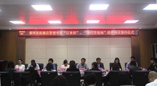 开办“现代学徒制”试点班、“品牌酒店订单班”是目前校企合作育人的新举措,是学校扩大招生影响力,企业方增加人才储备、提高员工素质、解决用工难等问题最直接有效的举措,也是现代高职院校创新人才培养模式、增强服务经济社会发展能力的有效途径。经过研讨协商,旅游系主任焦红强与开封开元名都大酒店张坤总经理签订了“酒店管理专业现代学徒制(试点)”合作协议,与郑州建业艾美酒店和美盛喜来登酒店签订了“喜达屋订单班”合作协议。