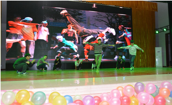 FJ街舞社劲爆激情的街舞拉开了晚会序幕,现场观众的情绪被瞬间引爆;相声《吹牛》引领观众走进了欢乐的海洋,诙谐幽默的段子、妙趣横生的包袱,使得现场观众捧腹大笑;该学院武协带来的《中国武术》,通过对中国传统兵器的应用,赢得在场观众的惊叹连连,顿挫之间展示中国武术的力量美;动听的《歌曲串烧》、幽默小品《五个男人一台戏》、优雅的《交谊舞》、动感十足的《爵士舞》、悠扬的《南山南》、时尚的《poping舞蹈》以及英文歌曲《Take me to your heart》等节目为现场师生呈现了一场视听盛宴,无不彰显着青春的风采、绽放着青春的活力,令观众折服。穿插其中的抢凳子游戏更是将晚会推向了高潮,学生们积极参与,在场观众们呐喊声此起彼伏。整个晚会精彩纷呈,高潮迭起,表演形式多样、内容新颖。