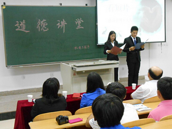 为弘扬中华传统美德,引导学生树立正确的道德观念,践行社会主义核心价值观,9月25日下午,由院党委宣传部主办、机电工程系承办的第13期道德讲堂在教学楼6103室举行。机电工程系党总支书记来卫东、辅导员曹林英、赵竟以及学生会各部室主要负责人、新生各班代表200余人参加了本次活动。