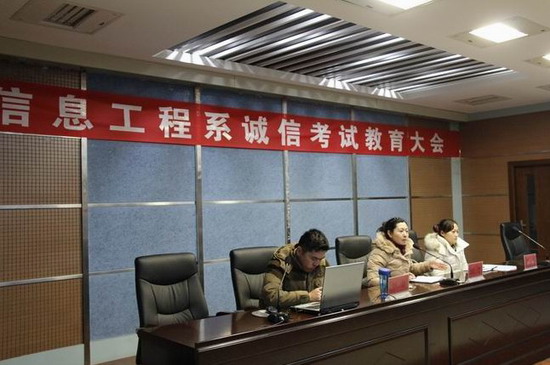 会上,张哲老师公示了近期该系违纪学生名单,宣布了“关于端正考风,严肃考纪的通知”,并强调诚信为做人之本,希望学生们都能诚信考试,考出自己的水平。学生代表顾路通倡议大家“以诚实守信为荣,以造假期骗为耻”。