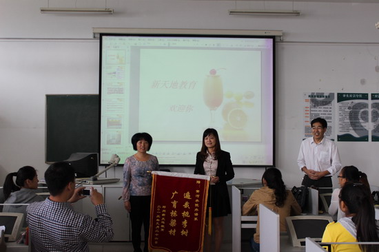 9月26日上午,郑州新天地外语学校校长郭佩霞一行3人专程到学院外语系招聘英语教师,并向外语系赠送“遍栽桃李树,广育栋梁材”锦旗,感谢外语系为他们输送了优秀的毕业生。外语系领导班子成员、教师和2011级、2013级学生参加了活动。