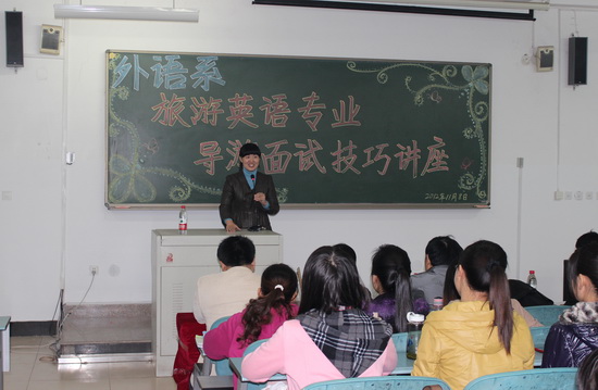 今年9月份,旅游英语专业2010、2011级55名同学顺利通过导游资格考试笔试环节。为了让他们在随后的面试中能流畅地进行导游讲解、自如地应对面试中出现的各种问题,从而取得优异的成绩;同时也为2012级新生增进对本专业以及导游考试的了解提供学习交流的平台。外语系于11月8日下午举办了导游考试面试技巧专题讲座,由开封市旅游局培训中心主任杨蕴杰主讲。外语系党总支书记关六三、副主任王成伟、外语系旅游英语专业教师以及旅游专业全体学生聆听了此次讲座。