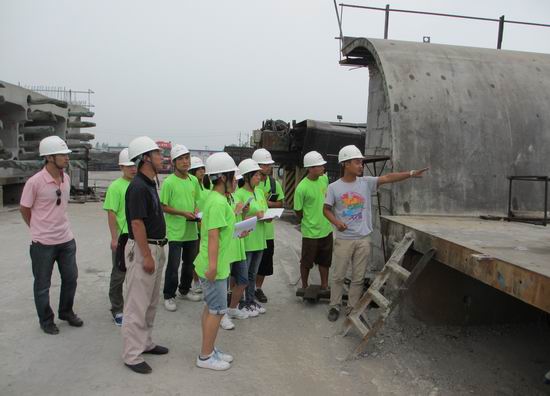 梁场安质部刘学部长首先介绍了中牟制梁场的场地布置、工程概况、建设的意义和施工进展情况,然后带领大家到施工现场观摩学习制梁施工工艺。在制梁场钢筋生产房,刘部长给同学们讲解钢筋弯制、焊接等工艺,随后又到各工序点为同学们详细讲解了灌注、张拉、压浆、封端等各施工工艺。最后来到存梁区参观成品梁,同学们对简支箱梁有了一定的感性认识。同学们一边参观记录,一边讨论交流,不时提出问题,刘部长都一一为他们做了解答。