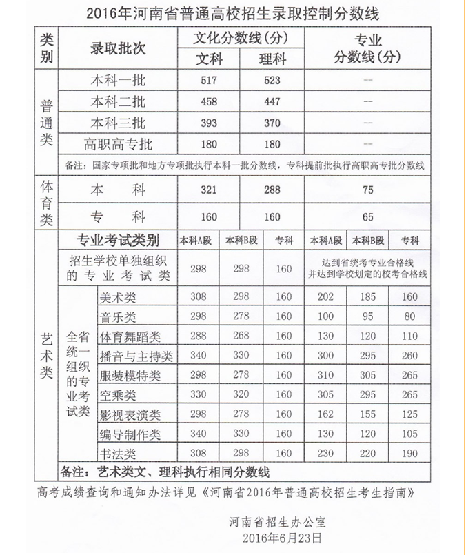 2016年河南省普通高校招生录取控制分数线