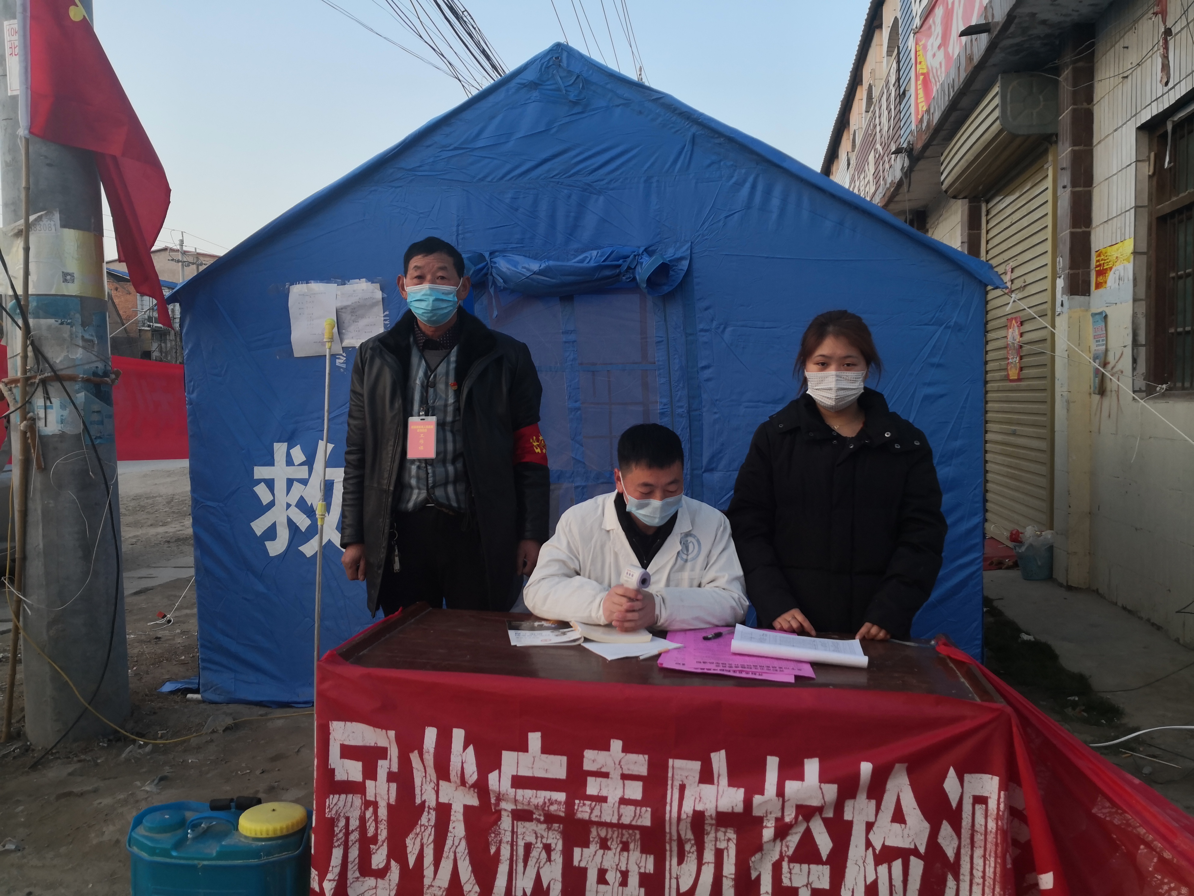 右三:正式党员吕明月(材料工程1701班)在村委会执勤点执勤
