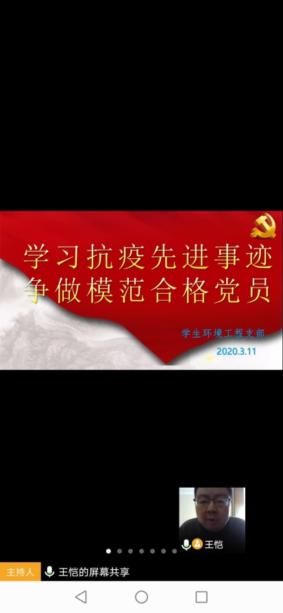 2020年3月12日上午10点30分,环境工程学院学生环境工程支部通过腾讯会议举行了主题为“学习抗疫先进事迹,争做模范合格党员”主题党日活动,支部全体师生党员参加,活动由学生支部宣传委员王恺老师主持。