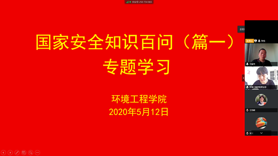 国家安全,人人有责。为推动学习贯彻总体国家安全观走向深入,引领教职工增强维护国家安全的责任感使命感,5月12日下午,环境工程学院利用腾讯视频会议组织全体教职工召开《国家安全知识百问》专题学习会,会议由副院长王振伟主持,全体教职工参加了此次会议。