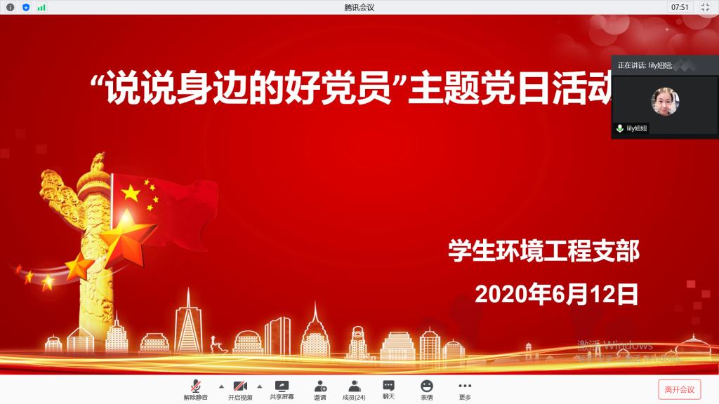612日,环境工程学院学生支部开展“说说身边的好党员”主题党日活动,支部全体党员、预备党员参加,活动由学生支部宣传委员王恺老师主持,以腾讯视频会议形式召开。