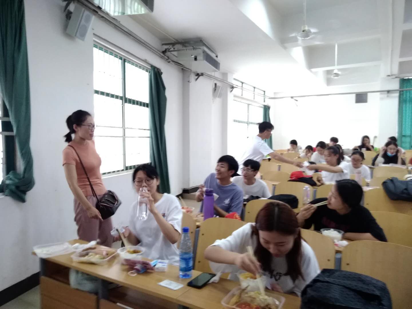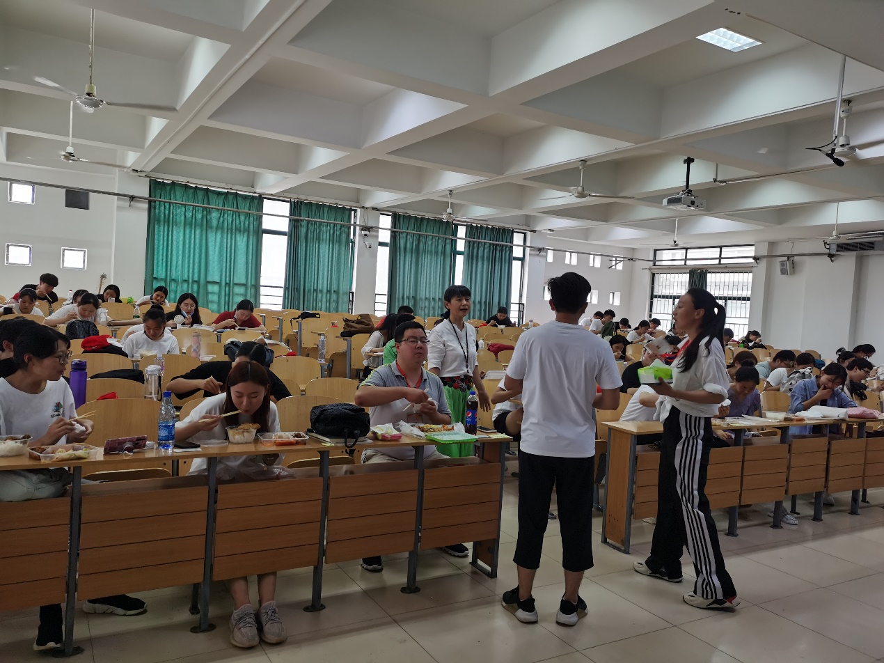 这些为了让学生及时吃上午餐的老师是曾宝亭、孙莉莉、耿悦、马琳娜、王维宇,她们顶着烈日、不辞劳苦把学生的盒饭从餐厅运到教学楼6202教室,即缓解了全校2000余名专升本学生集中用餐的压力,又为学生争取了午休的时间。为给特殊考生提供个性化服务,我院楚红英、申森、王海烽、崔鹏、王雪平等老师还开着爱车加入到爱心送考服务队中。正是由于老师们的辛勤付出、无私奉献,学生们才能够顺利准时奔赴考场,老师们用实际行动诠释了服务育人关爱学生的真谛,给学生上了一堂生动爱的教育课程。